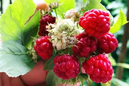 树莓,又叫做覆盆子,没错,就是和草莓很像的那个,不过树莓是长在树上的,也是能够食用的,味道吃起来有一点点酸,营养价值极高,有抗氧化和美白的作用哦。