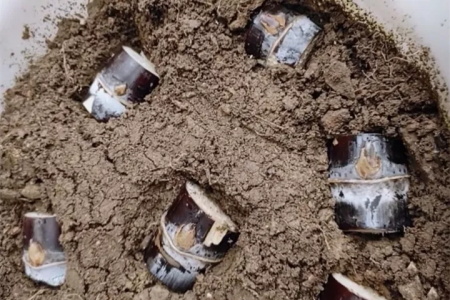 准备土壤,将晾好的甘蔗段平放在土面,如果切的甘蔗有多个节,就把每个节上的芽点朝向左右两边,如果切的甘蔗只有一个节,就把芽点朝上放,用土把甘蔗段轻轻掩埋。